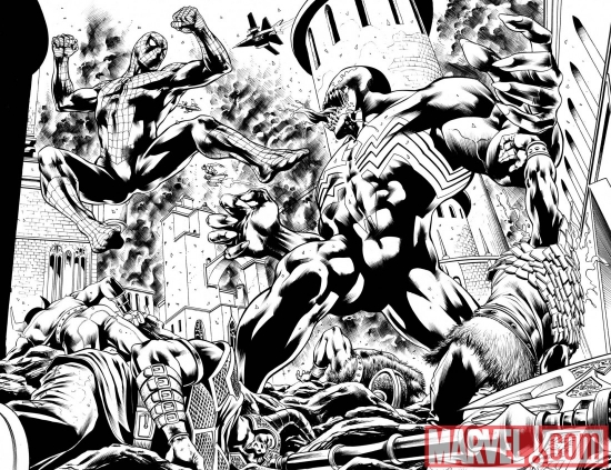 Tom Brennan mi chiese di sospendere momentaneamente Capitan America per dedicarmi ad un altro progetto. Io inizialmente risposi che avrei preferito finire Cap, anche perchè dovevo completare contemporaneamente una storia di Dampyr per la Sergio Bonelli Editore in quel periodo. Quando mi disse che era Spidey… beh non potevo rifiutare! E questa volta era Spidey davvero, contro la sua storica nemesi per giunta: Venom! Insieme al mio assistente alle chine Patrick Piazzalunga, abbiamo lavorato con grandissimo piacere a quelle 22 pagine. Alla fine è uno degli albi di cui vado più orgoglioso. A proposito: verrà pubblicato in Italia a Gennaio!