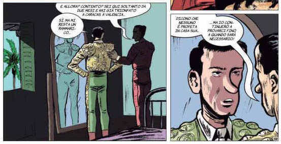 Il tratto di Miguel Fernández, al contrario, si sarebbe prestato facilmente ad accompagnare lo sguardo in digressioni più riflessive: spesso, infatti, il disegnatore inserisce, tra sezioni fitte di dialoghi, brevi respiri silenziosi che contemplano il paesaggio, da quello stretto tra i palazzi cittadini europei a quello ampio sulla steppa spagnola, in netto contrasto con i campi verdi e gli alti edifici dell’America meridionale. Con l’essenzialità del suo segno e la varietà delle gamme cromatiche, tenui e calde nel vecchio continente e sature e fredde nel nuovo, Fernández riesce a restituire molto bene l’atmosfera di un’epoca su entrambe le coste dell’oceano. Alla forza delle linee, invece, è affidata la resa delle emozioni: se la sorpresa o la rassegnazione alleggeriscono il viso dei personaggi dai dettagli superflui, la rabbia o la concitazione deformano come maschere immobili le fattezze degli uomini, caricando di energia le parole pronunciate.