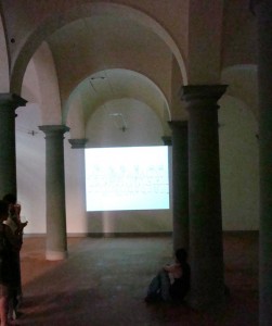 La mano di Costantini – giunto ormai a un equilibrio invidiabile tra spontaneità del tratto e controllo della tecnica – tracciava sicura linee nere sul bianco abbacinante del foglio, figure senza volto, scene crude di soprusi e torture, segnati da punti di colore “arancione Guantanamo“. Il pubblico passava dalla piazza esterna, dove un DJ alternava brani di musica lounge e si poteva sorseggiare del buon vino, a una sala con colonnato dove la proiezione stessa sembrava ingabbiata. Una performance intensa, sicuramente emozionante, che difficilmente ha lasciato indifferente anche chi era presente per caso; ne è stato prova il silenzio quasi religioso rispettato per tacito accordo dagli spettatori, chi in piedi, chi seduto in terra appoggiato alle colonne della sala.