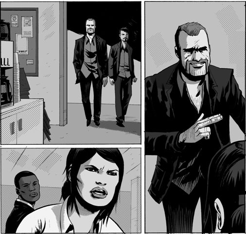 Sto molto attento quando scrivo al momento in cui viene voltata la pagina, cerco di sorprendere il lettore con questa accortezza (anche se nel fumetto americano non sempre i conti tornano, perché c’è la pubblicità) . In questa scena volevo ottenere un effetto preciso: nell’ultima vignetta della tavola dispari doveva esserci l’inquadratura dall’alto del cattivo che si girava di 3/4 alle sue spalle per guardare qualcosa che incombeva su di lui; nella tavola dopo, quasi una splash page, si sarebbe vista Catwoman che gli atterra in faccia. Il disegnatore, invece, ha mostrato nella prima delle due tavole, come ultima vignetta, un’inquadratura dal basso, in cui si vede Catwoman che piomba addosso al cattivo; sembrerà una piccolezza, ma così è stato smorzato completamente l’effetto che volevo dare con la pagina successiva.