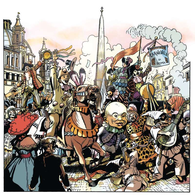L’albo inizia d’altra parte con un gioco di inquadrature che simula l’apertura di un sipario e con una piccola recita privata di una sarta che davanti allo specchio (il primo di molti) si inventa una vita più emozionante di quella riservatale dal destino, in una scena narrata in due tavole speculari di ottima resa e impatto. Nel finale poi l’azione si svolge durante il carnevale romano, che se vogliamo possiamo considerare una forma di recita collettiva.