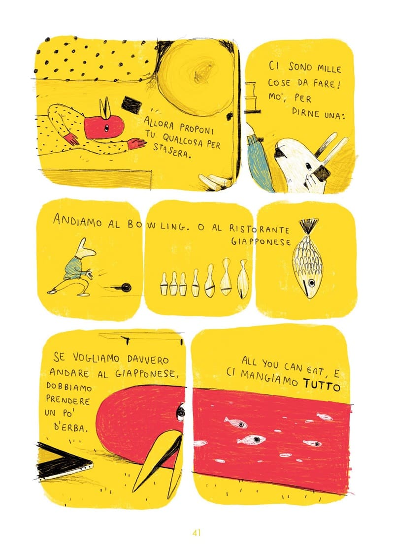 A distanza di un anno dalla pubblicazione della raccolta Le Cose Così, esce il 28 Settembre in fumetteria e libreria la prima vera opera totalmente inedita del giovanissimo autore napoletano, Mezza fetta di limone. Il protagonista è sempre l’Uomo Uccello che, in compagnia dei due amici Franco e Wilson, racconta col suo personalissimo stile una storia fra la fuga da ciò che non conosce e il rifugio nelle certezze racchiuse nella vita di tutti i giorni, certezze piccole ma immutabili, come la mezza fetta di limone nel drink.