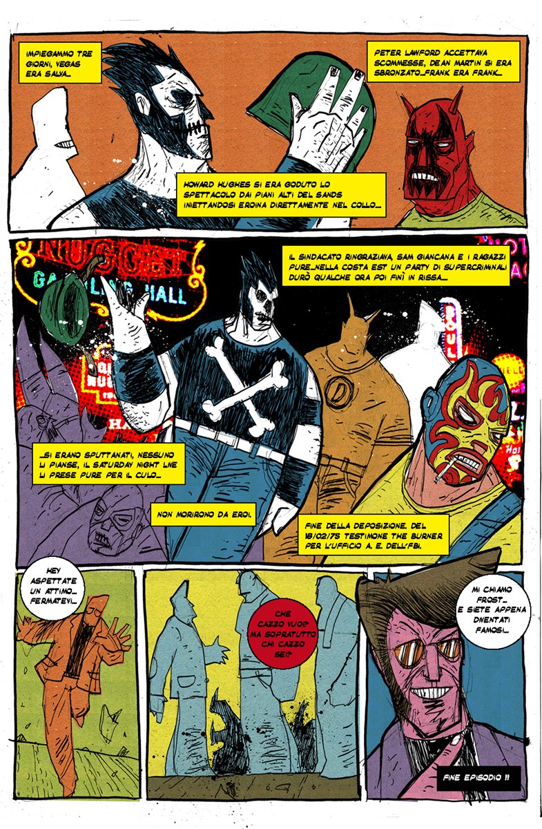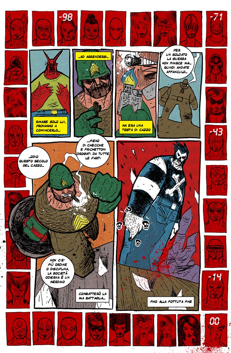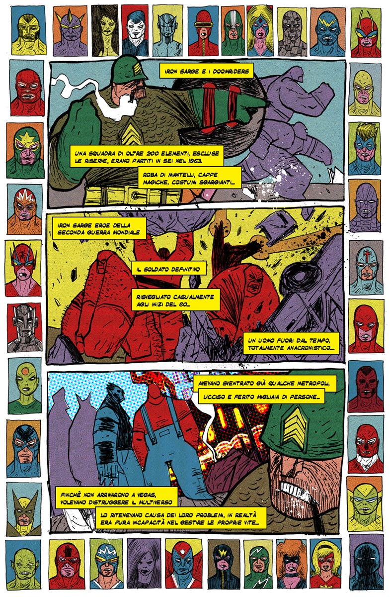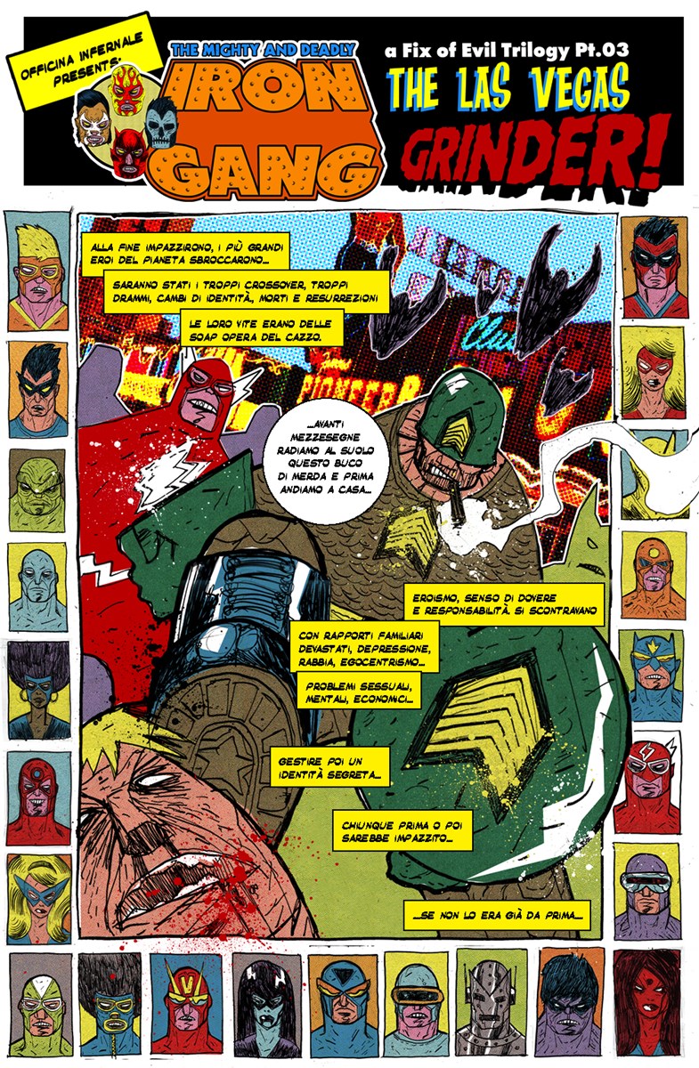 The Las Vegas Grinder. Questo episodio fa parte di una sorta di mia continuity mentale a cui subito non avevo pensato. Iron Sarge nasce sulle pagine di un fumetto realizzato per una rivista underground ai tempi di Black Church, quando avevo smesso di disegnare per almeno un anno e lavoravo di photoshop ed effetto fotocopia come non ci fosse un domani. Iron Sarge e i Doomriders erano degli eroi che erano impazziti, e, dopo essere stati ammazzati, stavano cercando di fuggire dall’inferno… Si le mie solite menate insomma. Quando ho scritto e disegnato questo episodio, senza rendermene conto, ho realizzato che stavo raccontando la discesa verso la pazzia di Sarge… Un flash pazzesco.