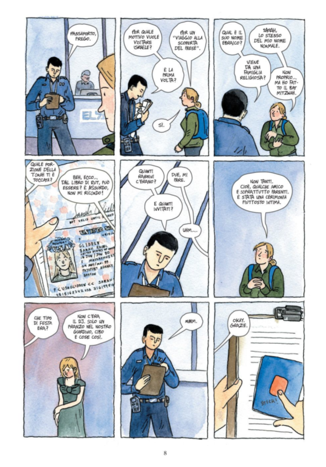 Purtroppo, per quanto si possa tentare di essere empatici con la crisi esistenziale che questo viaggio ha provocato in Sarah, il suo essere così fortemente coinvolta rende meno interessante il fumetto per un lettore “neutrale”, che viene continuamente sballottato tra una descrizione che tenta l’obiettività nella narrazione dei fatti, cercando di presentare punti di vista contrastanti (ma in realtà il punto di vista palestinese è individuato solo nella coscienza politica di Sarah, che andando in frantumi molto presto offre un contradditorio molto debole alla propaganda israeliana), e l’immersione nel flusso di pensieri profondamente emotivo di una ragazza in crisi identitaria.