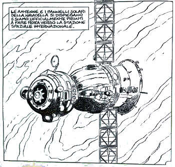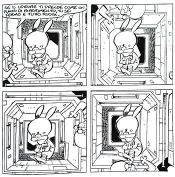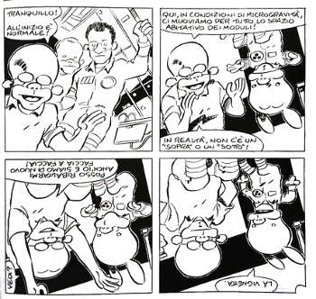 Interessante, poi, la soluzione adottata da Ortolani per far comprendere al lettore la particolare situazione in cui operano gli astronauti sulla Stazione Spaziale Internazionale. Per dare un’idea dell’ambiente a microgravità, l’autore non si limita a disegnare i personaggi fluttuare all’interno dei corridoi della Stazione, ma ruota gli stessi e le vignette all’interno della pagina, costringendo il lettore a ruotare a sua volta il volume per leggere le battute. Particolarmente efficaci, anche dal punto di vista educativo, sono poi le pagine 101 e 102 che permettono di comprendere visivamente l’essenza di un concetto fondamentale per la fisica come i sistemi di riferimento.