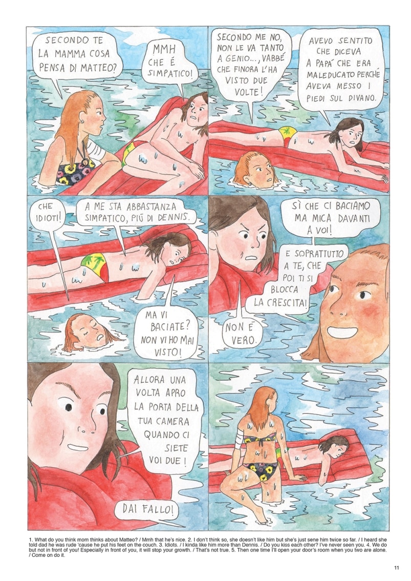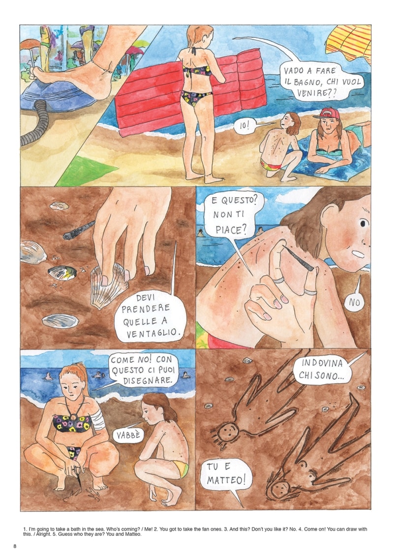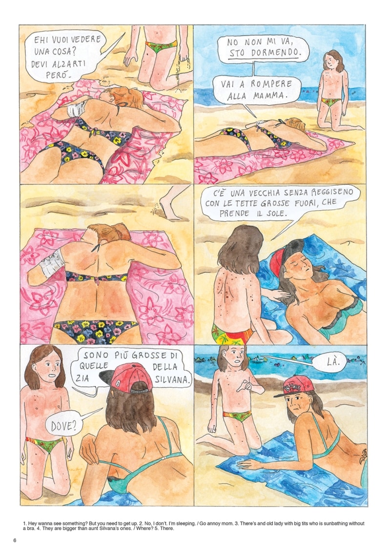 Una giornata al mare come tante se ne sono viste nella migliore commedia all’italiana, tra crema solare, bagni infiniti e un’afa insopportabile. Una madre e due sorelle: l’infanzia che si affaccia sulla preadolescenza tra gioco e ingenua curiosità e la scoperta delle prime vere pulsioni. Una storia breve che fotografa l’intimità e il turbamento dei ragazzi che stanno inconsapevolmente crescendo. La luminosità di un acquerello che restituisce in maniera acuta una scheggia di vita quotidiana: tic e vanità, freschezza e caducità della vita.
