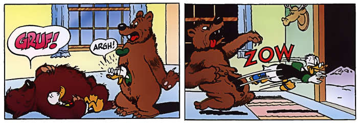 In questa divertente gag story, Paperone mette alla prova Paperino e i nipotini regalando loro alcuni giorni nella sua villa sulla cima di Monte Orso. Il vecchio papero, però, sta preparando loro una “sorpresa”: la sua intenzione è presentarsi alla villa travestito da orso 1 per verificare il coraggio di Paperino.