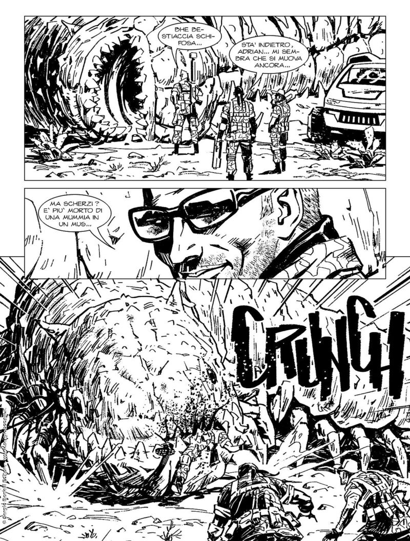 Michele Medda, con Massimiliano Bergamo ai disegni, riporta il nostro eroe in quella ambientazione con un richiamo all’avventura affidato alla visita del vecchio ma giovane amico Joey. Il racconto dell’antefatto, sintetico ma esaustivo, è affidato a un flashback con Legs in veste di voce narrante, dopodiché Nathan e la collega raggiungono il Territorio, area sempre più vessata da una politica corrotta e dalla mancanza di risorse che la rendono una terra di nessuno. Non è infatti la fauna locale a creare problemi agli agenti Alfa, ma gruppi di predoni, cultisti fanatici e una diffusa mancanza di etica e rispetto verso una natura brutalizzata da uomini insulsi.