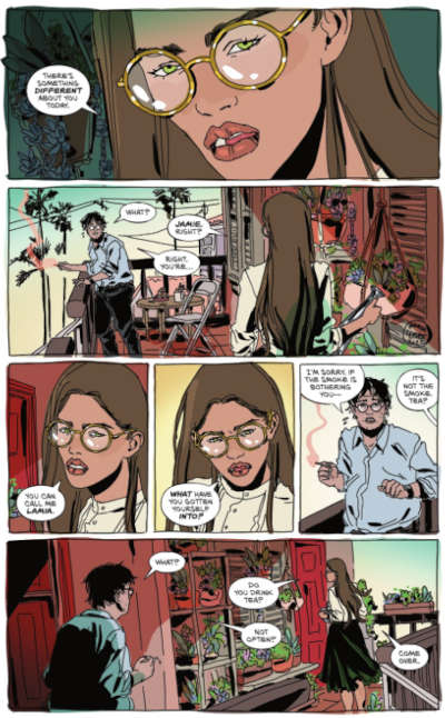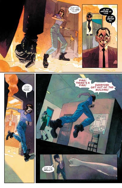 Questo primo arco narrativo vive del ritmo frenetico dato dall’accavallarsi di nuovi elementi e informazioni e dell’atmosfera grottesca e opprimente costruita dallo stile delle immagini: figure deformate e prospettive sghembe costruiscono scene visivamente squilibrate, che generano un senso di straniamento fisico che amplifica quello narrativo, forzato dalle continue rivelazioni. I colori invece, sempre messi sulla tavola in tonalità molto calde o molto fredde, esasperano i toni emotivi dei vari momenti (Fig. 1). Uno degli effetti secondari di questo approccio visuale è che il Regno del Sogno, ambientazione di alcune scene, appare più solido di quello della veglia, allusione al fatto che le trame che guidano gli eventi in corso minacciano la stabilità del mondo dei viventi. Su queste, annuncia il finale, indagherà il Corinzio, in coppia con lo spirito di Madison Flynn.