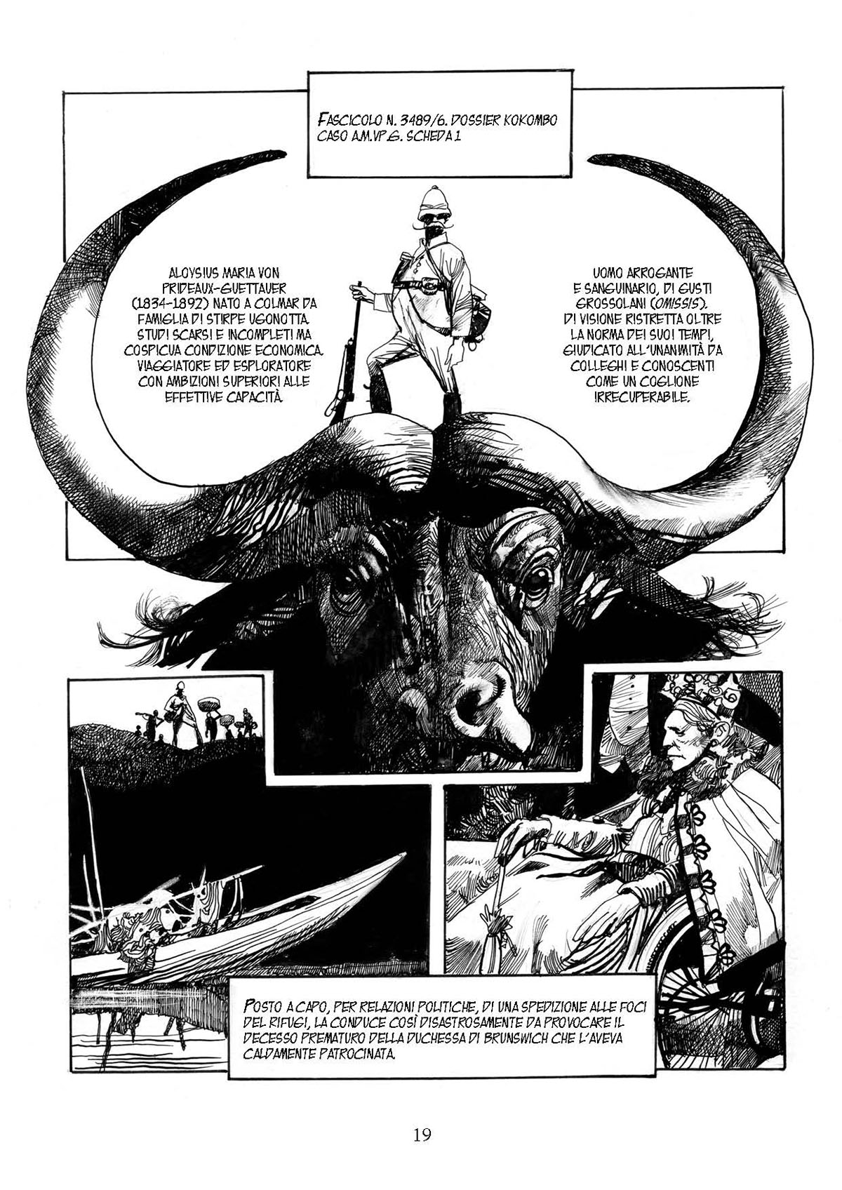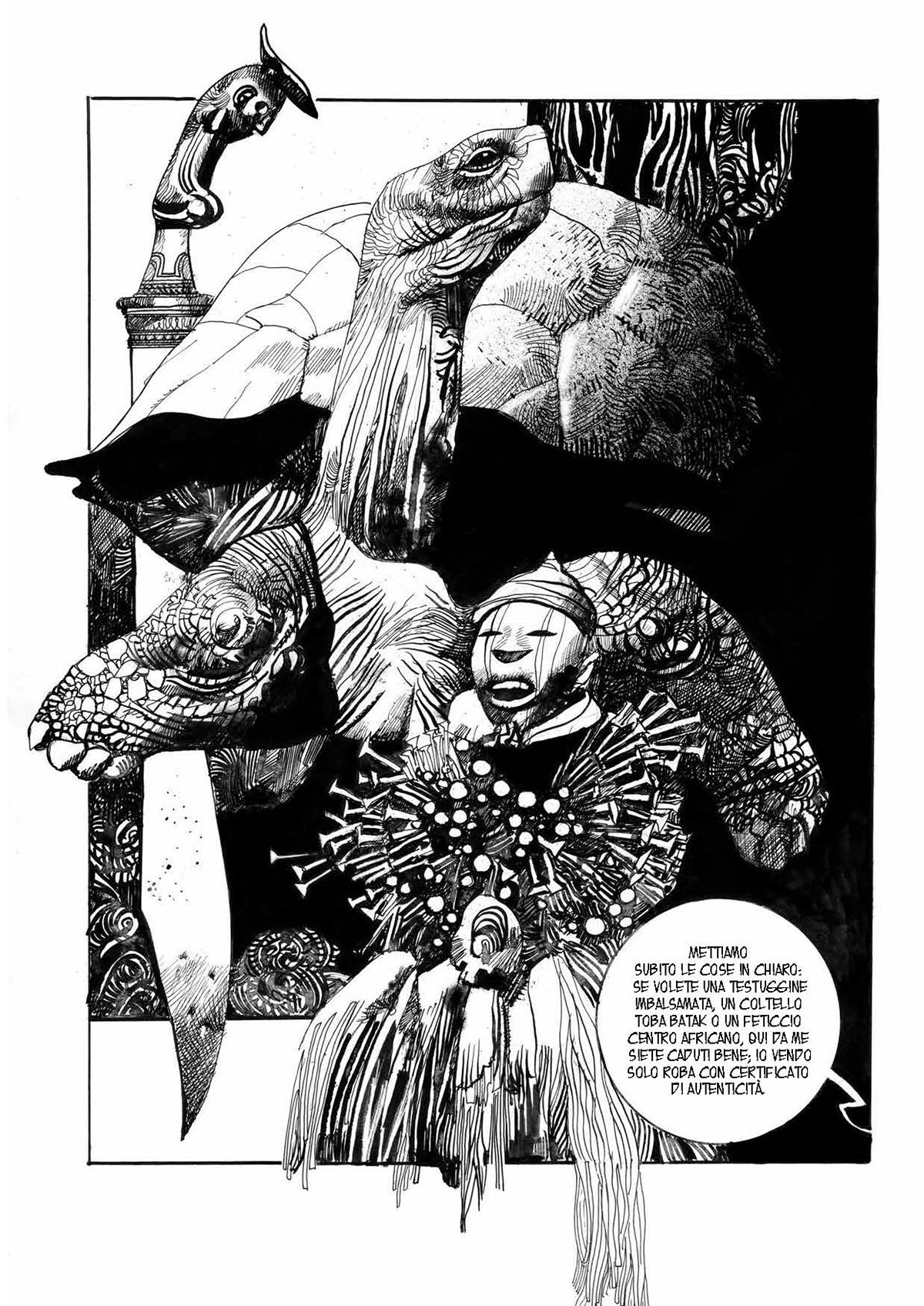 Ne Il dossier Kokombo – l’undicesima uscita della collana delle Edizioni NPE dedicata al maestro – l’arte di Sergio Toppi è al suo apice, tra barocchismi, citazioni pittoriche e straordinarie tavole esoteriche. Meravigliosi bianchi e neri che valicano i margini di gabbie e vignette, regalando volti, ambienti, scene a tutta pagina. Si leggono le emozioni dei protagonisti, si partecipa alle vicende, si entra nelle storie. Un tratto inconfondibile, quello di Toppi, che non ha eguali. Come le sue narrazioni.