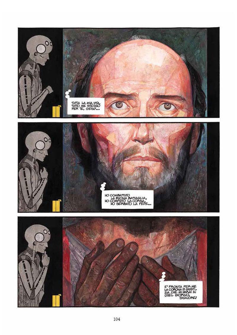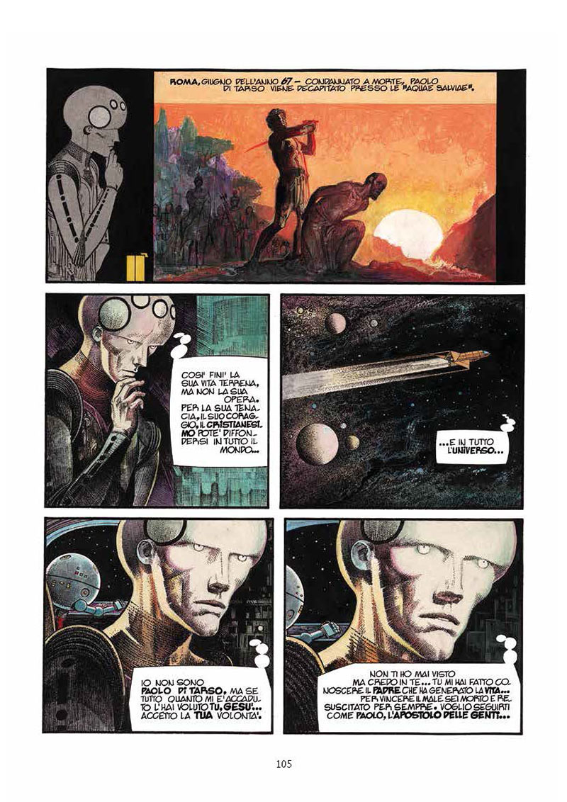 La storia è caratterizzata da una doppia formula grafica: realizzazione con pennini a inchiostro per le scene ambientate nel futuro e l’utilizzo di tempere e pennelli per le proiezioni dei filmati di san Paolo, una tecnica che non ha precedenti. De Luca, dopo la Trilogia Shakespeariana, continua qui a sperimentare i metodi di resa dello scorrere del tempo e dello spazio attraverso il linguaggio sequenziale del fumetto.