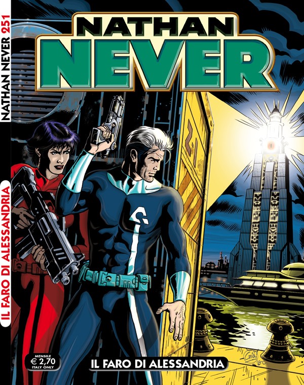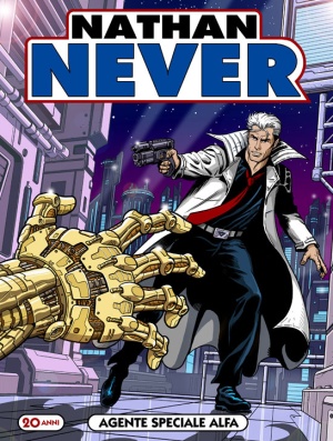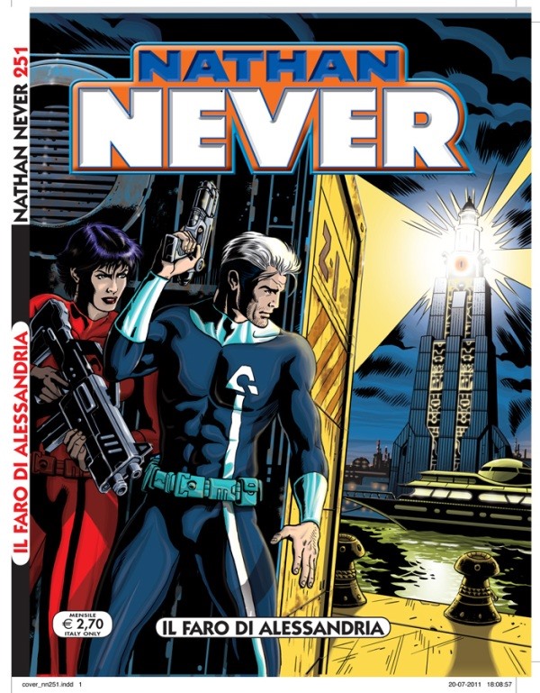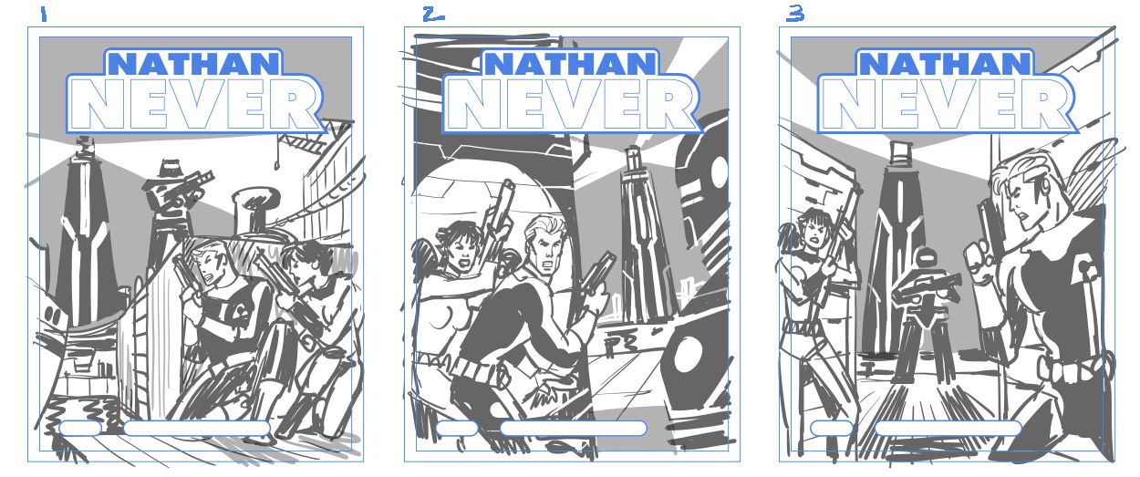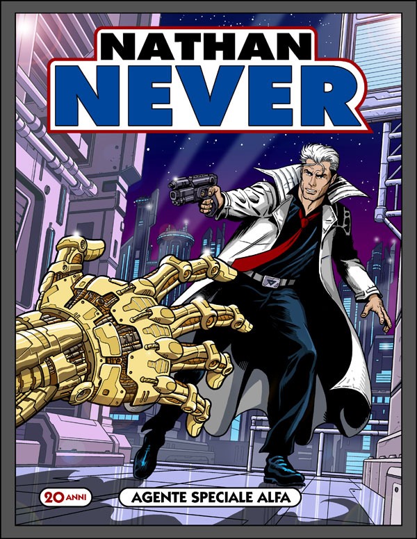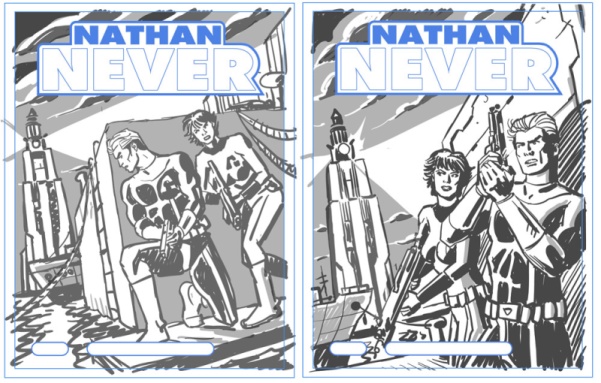 La scelta è stata di Antonio, voleva chiudere il ventennale di Nathan Never e aprire il nuovo ciclo con una cover celebrativa che omaggiasse il mitico numero uno. Quando mi comunicò la volontà di affidarmi delle prove per le copertine, casualmente io avevo già in lavorazione qualcosa del genere, che avrei voluto postare sul mio blog per festeggiare il compleanno di Nathan (feci la stessa cosa già in passato per i venticinque anni di Martin Mystère). Insomma, la scelta fu naturale e supportata da validi motivi: gli elementi della storia del numero 250 si sposavano alla perfezione con l’impostazione della copertina, in più l’omaggio poteva essere gradito ai lettori fedeli e allo stesso modo attirare l’attenzione di chi nel corso degli anni aveva smesso di seguire la testata. Va da sé che inoltre la cover del numero uno era perfetta per presentare il personaggio al pubblico, chissà che anche la sua rielaborazione non riesca a incuriosire per la prima volta qualche nuovo lettore!