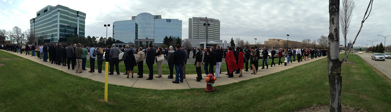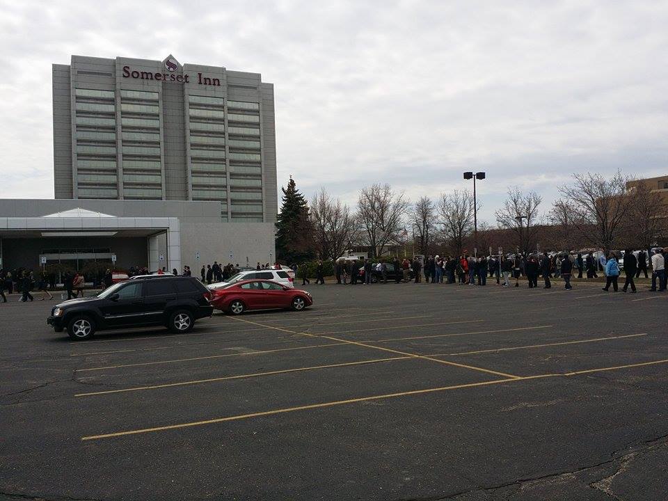 La fila partiva dalla parte est dell’hotel (questo segmento era composto da almeno 1.000 persone). Poi di nuovo lungo Big Beaver road, in cui c’erano circa 1500-2000 persone, poi scendeva attraverso il parcheggio e vicino al lato ovest della via d’ingresso. Quindi, in pratica, le ultime persone nella fila sempre crescente e in movimento, erano all’ingresso, e il loro tempo di attesa era di quasi 2 ore a quel punto.