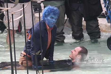 Il sito FanGirl.org ha intanto diffuso numerose immagini dal set che ritraggono gli attori Nicholas Hoult e Michael Fassbender impegnati in una lotta all’interno di una fontana. Da notare che il look di Bestia è molto simile a quello di Kelsey Grammer visto in X-Men: Conflitto Finale.