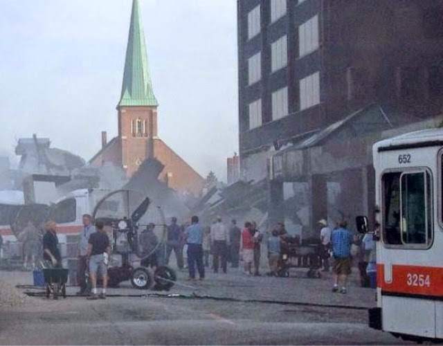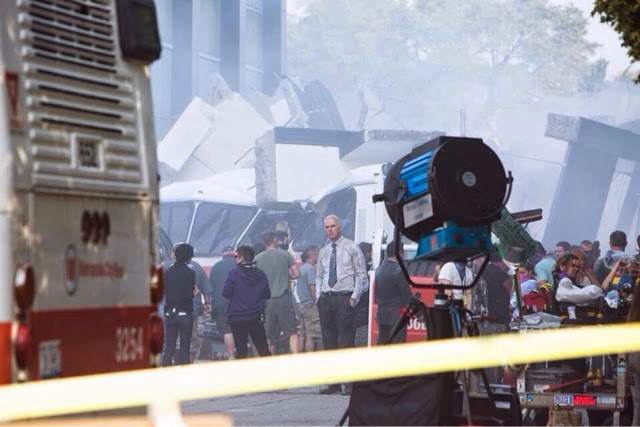 Molte controfigure e stand-in [controfigure riprese di spalle ndr] di Bruce Wayne erano sul set oggi. La scena riguardava il salvataggio di una ragazza e il crollo di un grosso pezzo del palazza delle Wayne Enterprises. Basandomi sui vari autobus e le auto della polizia, si presume che il tutto sia ambientato a Metropolis.