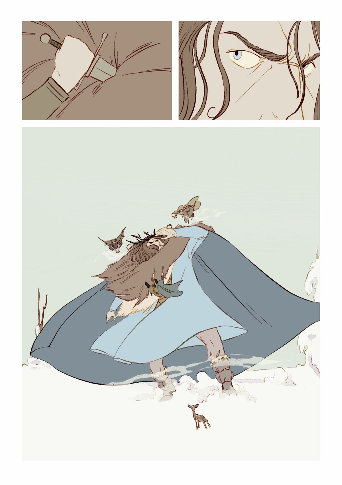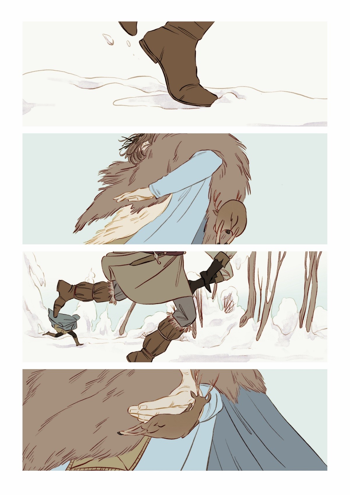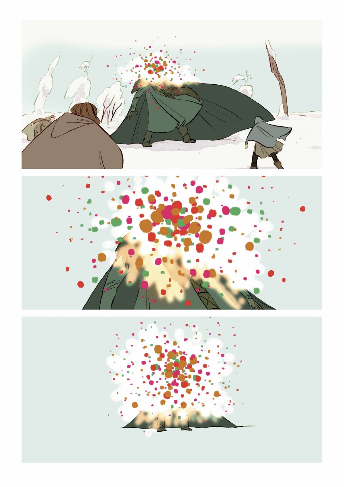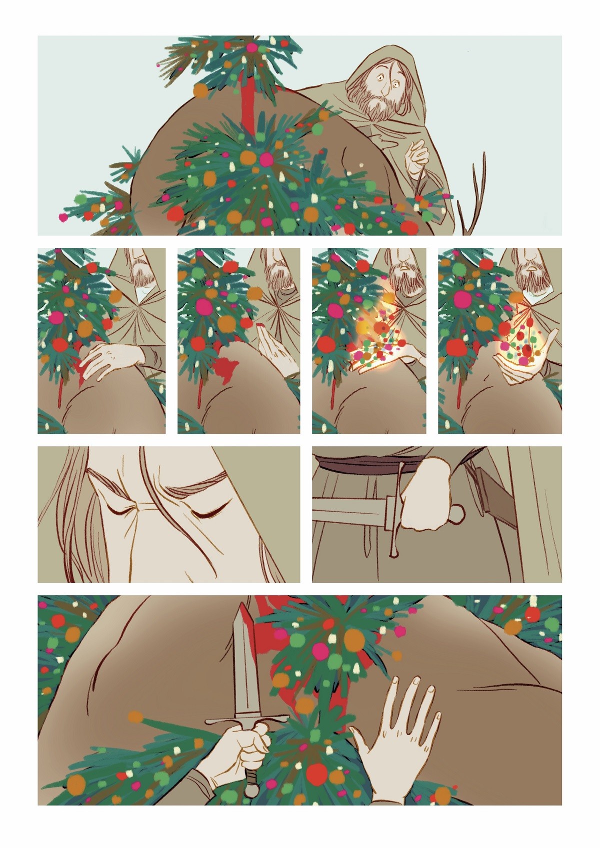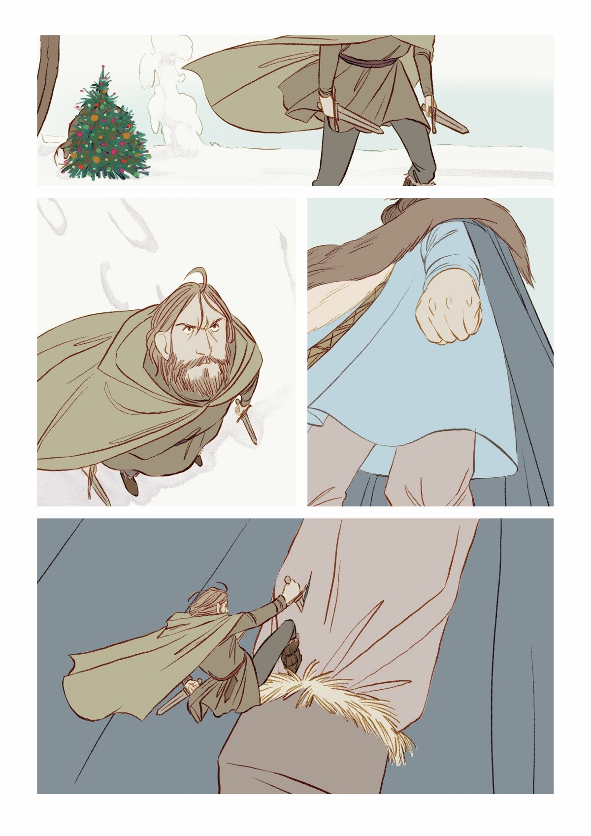 E visto che l’idea è piaciuta anche a lei, eccoci qui dunque, a presentarvi una racconto di Natale forse diverso da quello che potete solitamente aspettarvi per questo periodo. E’ un fumetto a tratti crudo e struggente, ma in cui è però ben radicata la speranza, quel sentimento che forse può sopravvivere anche alle prove più dure. I disegni eleganti, tanto moderni quanto legati alla più classica tradizione fiabesca, ci portano nel centro di una battaglia a prima vista impossibile da vincere, contro un metaforico carnefice, potente e impietoso. Freddo e inarrestabile. Ma il Natale nasconde una magia potente che scorre nel sangue dei caduti…