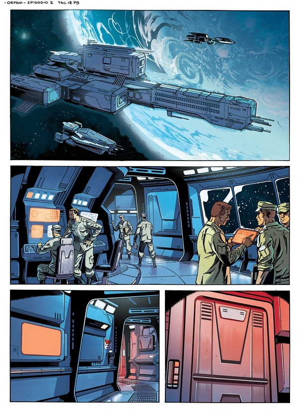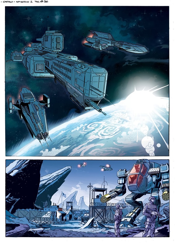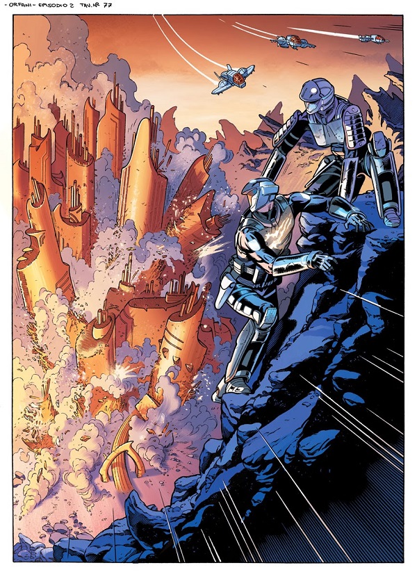 Proprio questa sensazione di già visto e già letto rimane il grande difetto di Orfani. La serie risente un po’ troppo della vena citazionistica di Recchioni e più di una volta passano per la mente scene e brani di Ender’s Game (Il Gioco di Ender) di Orson Scott Card o Starship Troopers (Fanteria dello Spazio) di Robert Heinlein, così come sono irritanti alcuni dialoghi da blockbuster americano che i personaggi si scambiano durante le battaglie o nei momenti topici della trama.