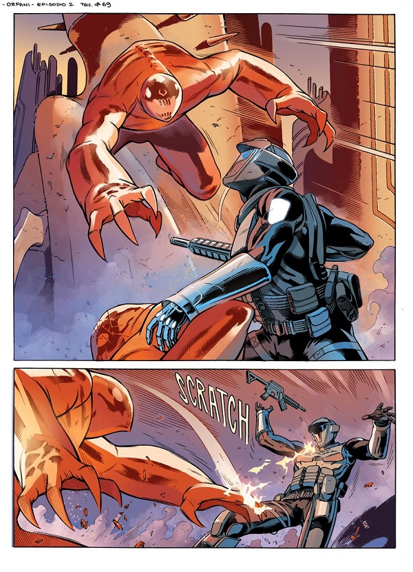 È in questa sezione che scopriamo cosa è successo dopo la battaglia che nel numero scorso aveva visto prevalere le forze terrestri, grazie all’arrivo sul campo di questi super soldati. Decisi a scoprire nuove informazioni sui misteriosi alieni, sospettati di avere devastato la Terra alcuni anni prima, gli Orfani Angelo e Boy Scout; partono per una missione d’infiltrazione.