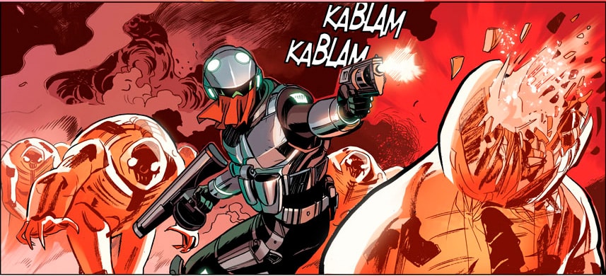 E se i videogiochi, oggi come oggi, sono il mercato di entertainment di gran lunga più sviluppato e con numeri impressionanti (da far crepare di invidia musica, etc. con numeri che centuplicano quelli del fumetto) l’ambientazione della storia e lo sviluppo strizzano l’occhio, a voi la scelta anche qui delle percentuali, a una narrativa di genere di combattimento (in ambito fantascientifico e futuristico), partendo da Fanteria dello Spazio a Il grande uno rosso (a detta di Recchioni film e romanzo usati come termine di paragone con Sergio Bonelli per spiegare quali atmosfere sarebbero state protagoniste della serie) e a un filone di successo dei videogiochi quali Doom, Quake, Killzone.
