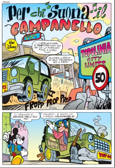 Per Chi suona il campanello diventa invece per Alessandro Sisti, coadiuvato ai disegni da Graziano Barbaro, pretesto per una riflessione sull’indole avventurosa e la pulsione alle passioni di Topolino (e di conseguenza di eventuali lettori). Il richiamo all’opera di Hemingway è principalmente filosofico, evocando l’idea di una chiamata, che sia dal campanello di una porta piuttosto che da una campana. Topolino è in crisi, preoccupato delle conseguenze sulla propria cerchia sociale delle sue continue assenze avventurose, domandandosi se non sia il caso di aspirare a una vita più “normale” . Lo scrittore (o quanto meno qualcuno che non si presenta ma che lo richiama nelle fatezze e nel mestiere di giornalista) arriva quindi con il pretesto di un’intervista, solo con l’intenzione di pungolare l’eroe e riattizzare il famoso “sacro fuoco” della sua passione.