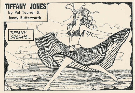 Nel 1964 sul quotidiano londinese Daily Sketch comparve una strip che aveva per protagonista una bellissima ragazza bionda: Tiffany Jones. Ve lo dico francamente, Tiffany non ha l’importanza culturale o artistica di una Valentina o di una Mafalda, tanto per citare due splendide (e diversissime) eroine dei comics. Però possiede un privilegio che per il periodo fu unico: due autrici donne. Jenny Butterworth, sceneggiatrice, e Pat Tourret, disegnatrice, furono due tra le donne più famose nell’Inghilterra degli anni ’60 e ’70 e la loro bella Tiffany Jones un perfetto specchio femminile di mode e costumi di un periodo pieno di ottimismo come quello della Swinging London.