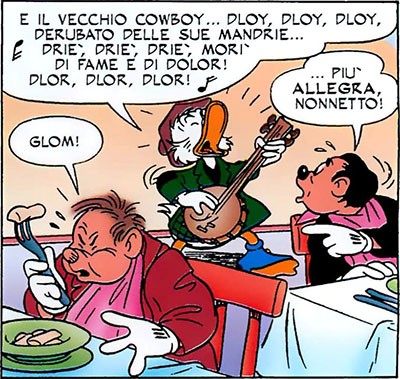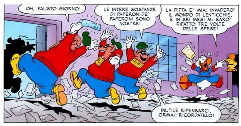 Da Barks l’autore veneziano riprende proprio quella moltitudine di emozioni tra le quali Paperone passa nel giro di una vignetta e quella sconsideratezza fanciullesca che nei decenni seguenti si è senz’altro spenta ma che connotava in maniera peculiare il magnate. Il Paperone che immola il suo intero patrimonio per l’affare delle lenticchie può suonarci eccessivo al giorno d’oggi, ma rientrava pienamente nell’ottica barksiana di un vecchio papero disposto a comprare tutte le monetine coniate in un certo anno per poi distruggerle tenendone solo una di modo che diventi la più rara al mondo (Zio Paperone pesca lo skirillione). O capace di investire un certo capitale per dimostrare a Qui Quo Qua di essere uno zio migliore di Paperino sotto Natale (Paperino e la scavatrice).