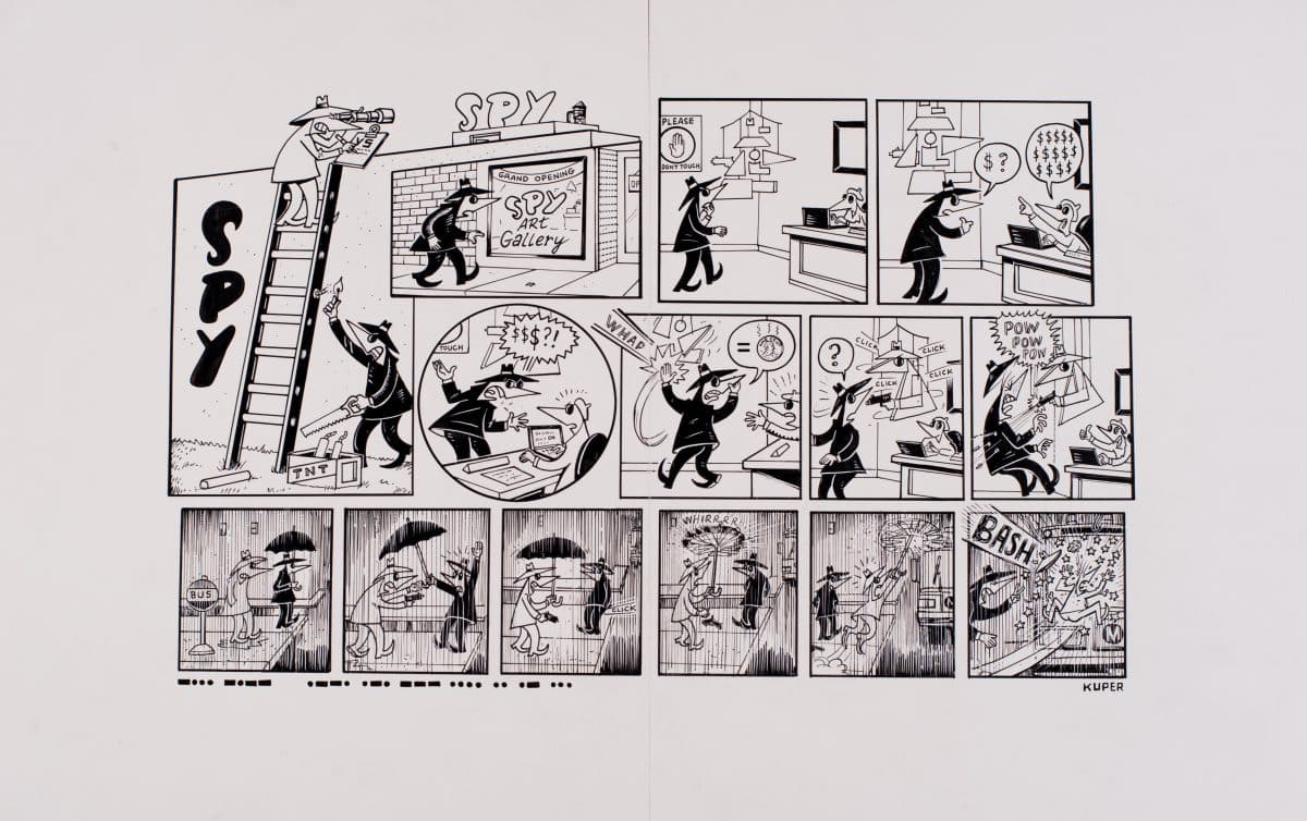 Più che muti si possono definire sicuramente kafkiani. Fra i lavori di questo tipo c’è anche la serie di strisce SPY VS SPY che pubblico per Mad Magazine. È stimolante consegnare delle storie ai lettori senza utilizzare, o utilizzando solo per lo stretto necessario, il linguaggio. Per questo devo fare attenzione a inserire delle immagini che possano essere comprese da te che stai in Italia, così come dal lettore che vive in Giappone o parla inglese, e questo processo di condensazione del senso nell’immagine è davvero interessante per me. Ciò che conta è individuare il simbolo universale, o in alternativa ciò che io posso trasformare in simbolo universale in base al contesto.