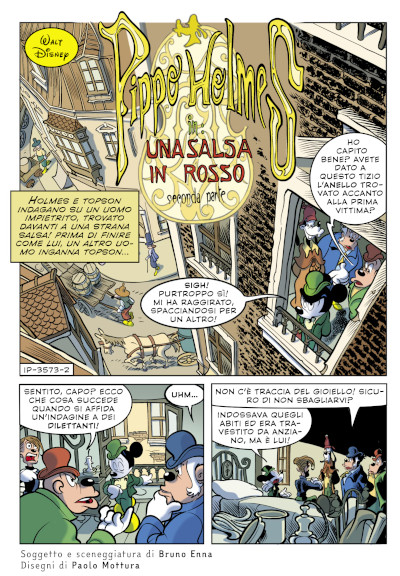 Lo stesso approccio Enna lo rispolvera nel momento di riprendere Uno studio in rosso e Il mastino dei Baskerville: la fedeltà alla scansione degli eventi impostata da Conan Doyle è solidamente presente, semplicemente lo sceneggiatore sardo modula alcuni elementi che potrebbero far funzionare meno il racconto una volta calato nelle tavole disneyane: per Uno studio in rosso – tramutato in Una salsa in rosso – diviene apprezzabile la gestione di tutta la seconda parte dell’avventura, con il lungo flashback del romanzo che viene presentato come un racconto dentro il racconto, snellito e narrato con il giusto piglio per evitare di annoiare il lettore. In questo senso risulta determinante il lavoro del disegnatore Paolo Mottura, che sfodera una tecnica di illustrazione pittorica per differenziare quelle pagine dalle altre e che risulta veramente affascinante.