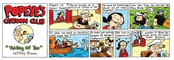 Le tavole domenicali, che prenderanno il nuovo titolo di Popeye’s Cartoon Club, saranno realizzate ogni settimana da disegnatori differenti, tra i quali sono da citare Alex Hallatt, Erica Henderson, Tom Neely, Roger Langridge , Lar deSouza e Jeffrey Brown.