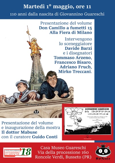 A seguire, lo studioso Guido Conti presenterà il volume Il dottor Mabuse (editore Libreria Ticinum), la prima ristampa di un fumetto realizzato da Guareschi stesso nel 1937 per il Bertoldo, e inaugurerà la mostra delle tavole del fumetto.