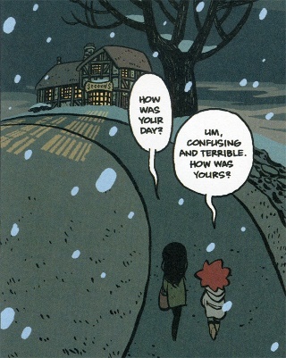 Per restare nell’ambito grafico, è doveroso spendere due parole sullo stile sfoggiato in Seconds: si può notare una certa continuità nella rappresentazione degli esseri umani da parte di O’Malley che va dal tratto underground di Alla Deriva per passare attraverso un disegno più tendente al manga di Scott Pilgrim. Nel suo ultimo lavoro l’artista opta una sorta di crasi tra le due estetiche, operazione che si può apprezzare nei personaggi, i quali smorzano elementi tipici del fumetto orientale come gli “occhioni” ma che nel contempo mantengono delle figure dall’aspetto poco realistico, pupazzesche e “pucciose”, non prive di alcune deformazioni fisiche utilizzate per sottolineare scene particolari.