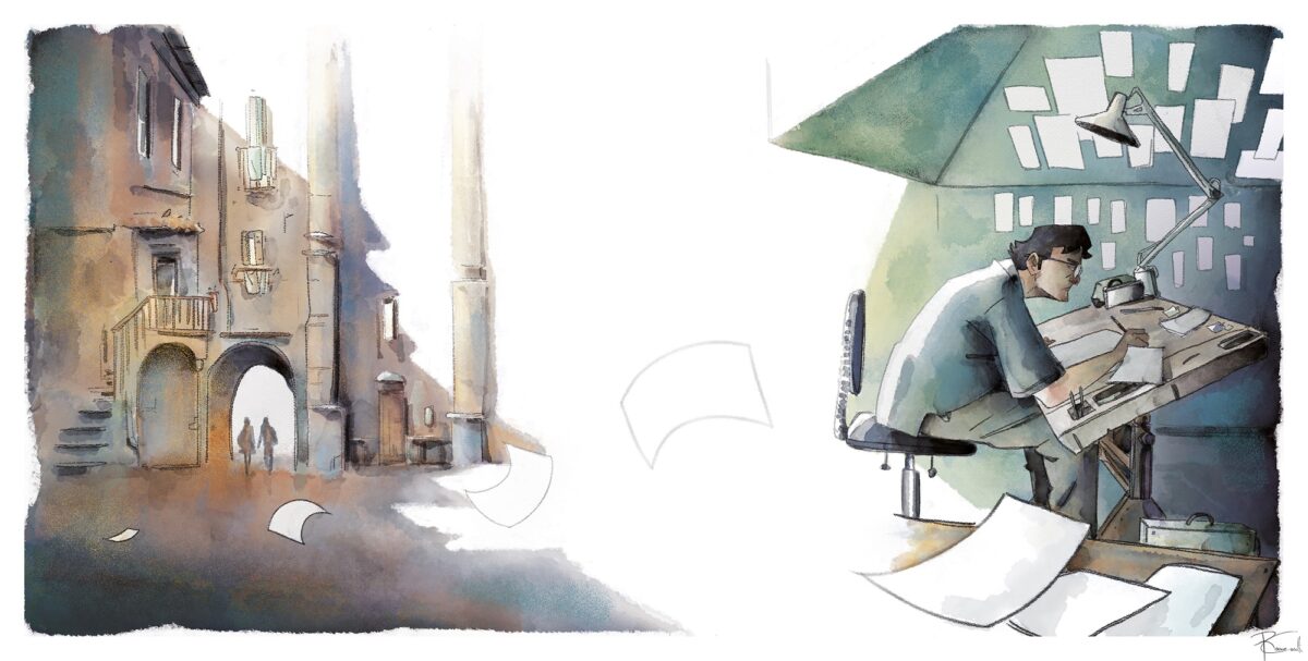 Il margine tra due vignette mi ha sempre affascinato per la sua magia e per il suo mistero. In quello spazio bianco l’immaginazione di che guarda prende due immagini separate e le trasforma in una. Si diventa complici nella creazione della storia grazie a quello stacco, simile a un silenzioso accordo. É un ponte che sfrutta l’immaginazione, un limbo dove entra in gioco il tempo, lo spazio e il movimento. Con la mia illustrazione ho cercato di omaggiare questa promessa tra autore e lettore che ha come firma solo un piccolo spazio bianco – Rocco Casulli