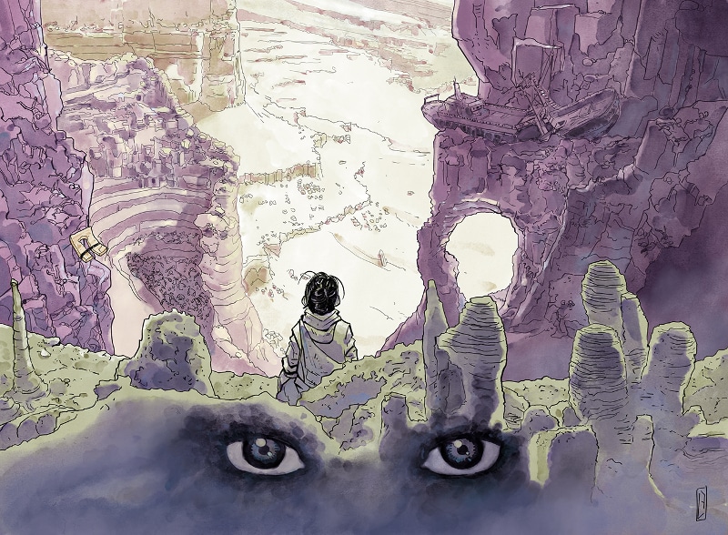 Mediterraneo, firmato dal giornalista e scrittore Sergio Nazzaro e dal fumettista Luca Ferrara, è la storia di un mare che, per vergogna e pudore, ha deciso di ritirare le sue acque, svelando tutto ciò che finora ha nascosto. È il racconto di un viaggio, proprio come quello intrapreso dai migranti salvati dall’Aquarius; il viaggio della protagonista Amalia che, però, al posto del mare incontrerà una profondità arida di sabbia e corpi: ciò che resta di quella che una volta era la culla delle culture. Il più grande cimitero d’Europa si mostra dunque ai lettori nella sua semplice crudeltà.