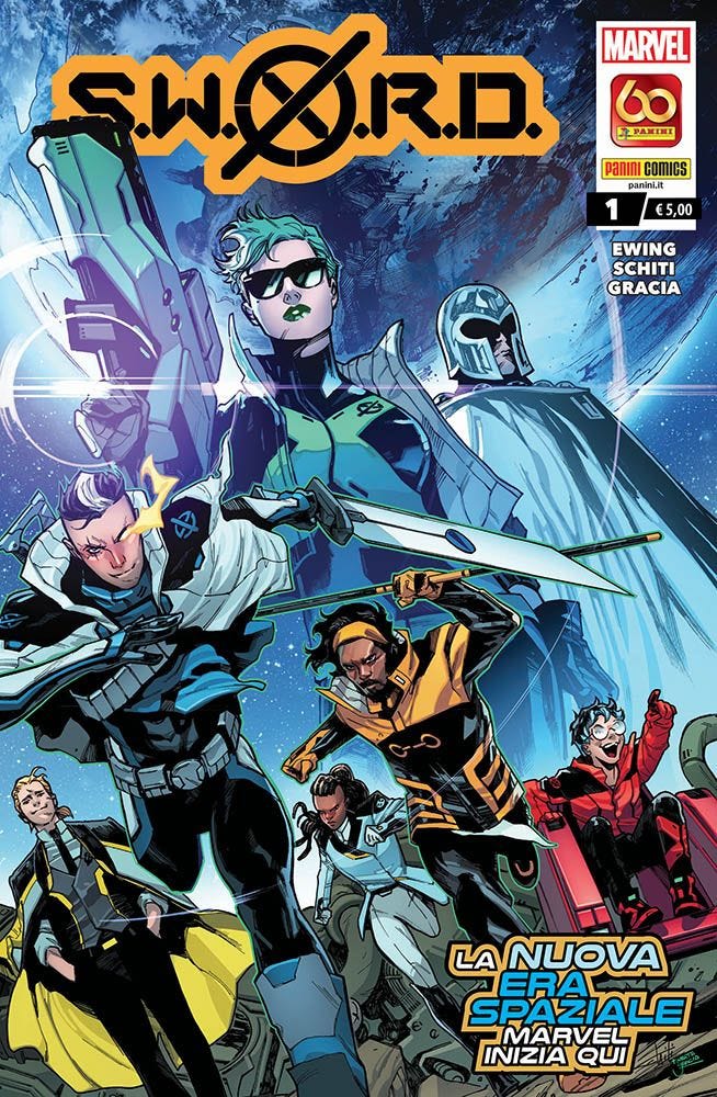 Partiamo dagli autori. Lo sceneggiatore Al Ewing è uno degli scrittori più interessanti approdati alla Marvel negli ultimi anni, grazie soprattutto al successo di pubblico e di critica della serie Immortal Hulk, con una rilettura apocalittica, psicanalitica ed horror del Golia verde. Ewing si adatta fin da subito alla dimensione e all’assetto del mondo ri-creato da Hickman, ma al tempo stesso se ne allontana percorrendo una propria strada concettuale e narrativa che, pur mantenendo contatti con l’universo mutante, si rivela estremamente autonoma e dotata di una propria individualità che la rende quasi una lettura a sé stante. Valerio Schiti fa da efficace contraltare grafico ai testi, con tavole sontuose e ricche di dettagli, evidenziate anche da uno storytelling molto fluido e di stampo cinematografico. Il lavoro di entrambi su questa nuova testata costituisce un trait d’union tra il rinnovato mondo mutante e il resto dell’universo Marvel, sia perché autori (insieme a Dan Slott) della miniserie crossover Empyre di cui S.W.O.R.D. costituisce una sorta di proseguimento spin-off, sia perché qui ci muoviamo su un sentiero di fantascienza che è uno dei cardini principali della gestione delle serie degli X-Men da parte di Hickman.