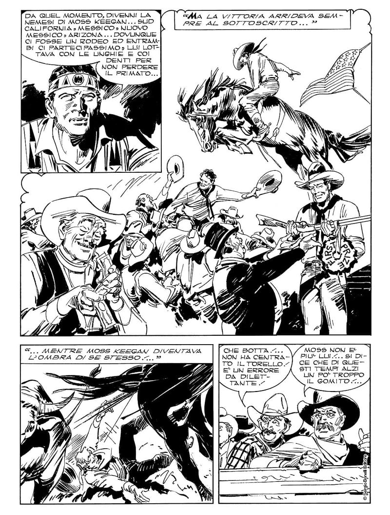 Attraverso il bianco e nero dell’inconfondibile tratto del maestro Giovanni Ticci, assistiamo al salvataggio da parte di Kit Willer di un ragazzo Pima, aggredito nella riserva Navajo. Tex scopre così che si tratta del figlio di una sua vecchia conoscenza, Moss Keegan, e rievoca i tempi in cui, concorrendo nel rodeo di Laredo, riuscì a strappargli la palma di campione. La rivalità tra i due sfociò in aperto scontro, finché Keegan ebbe un brutto incidente, in cui Tex gli salvò la vita. Anni dopo, cercando di consumare la sua ultima vendetta sul bieco sceriffo Mallory, che era rimasto a guardare durante l’assassinio di suo fratello Sam, Willer ritrovò Keegan sulla sua strada. Ma come alleato o come nemico?