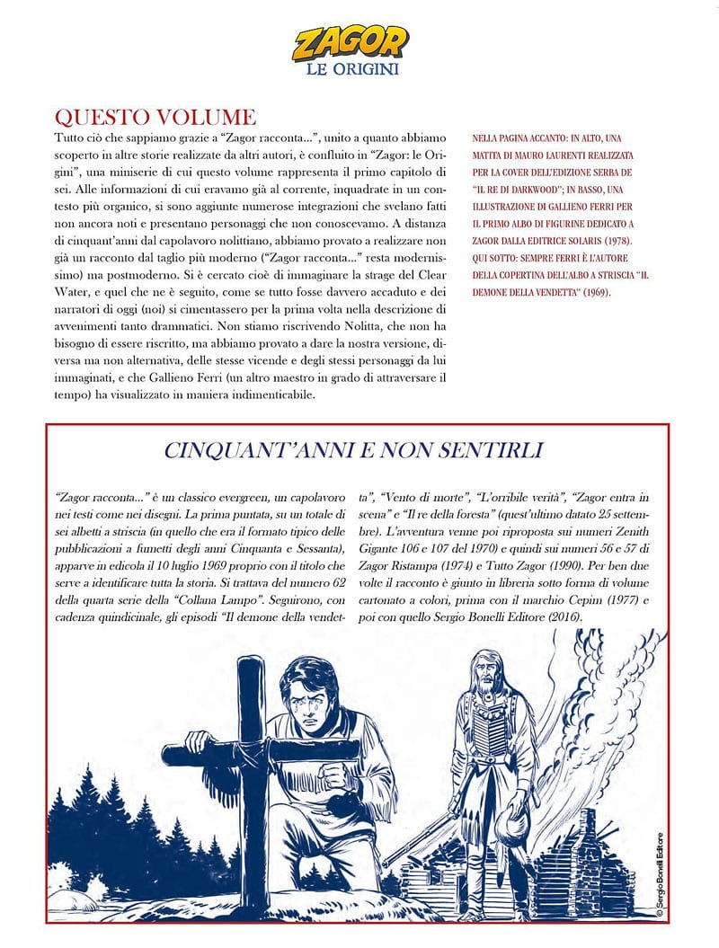 Sempre dal 24 gennaio sarà il momento di Zagor. Le origini. Il volume riscrive, in una versione drammatica e moderna, gli avvenimenti che segnarono il destino del giovane Patrick Wilding trasformandolo in Za-Gor-Te-Nay, lo Spirito con la Scure. Una vicenda complessa, fatta di affetti familiari, amore, amicizia, odio e persino di vendetta e di morte, raccontata con sorprendenti retroscena: inattesi per chi già credeva di conoscere tutto di Zagor, inquietanti e avvincenti per chi ne scopre le origini per la prima volta.