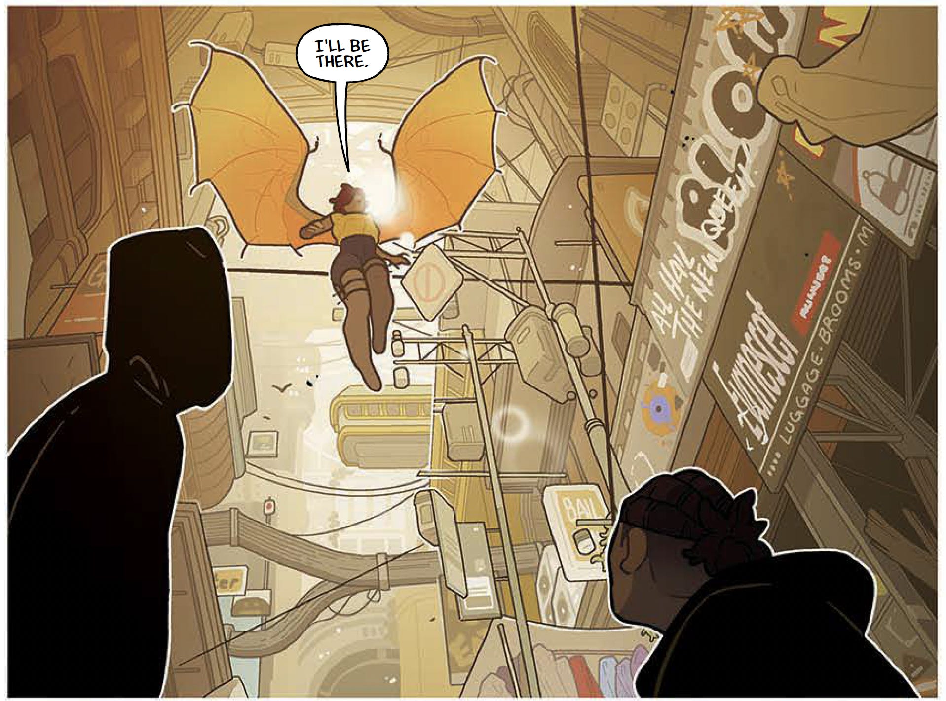 La storia è ambientata nell’ultima città sulla Terra, Kiros, dopo una guerra catastrofica che ha posto fine al mondo. Per me era fondamentale trasmettere la sensazione di sovraffollamento: questo è l’ultimo posto in cui chiunque può vivere, quindi le persone sono letteralmente una sopra l’altra. Ho guardato molto a città con densità abitative estreme: Tokyo, Hong Kong, Kowloon City… Allo stesso tempo, Kelly voleva qualcosa che richiamasse Blade Runner, ma più luminoso: meno pioggia, più visibilità, più neon. Io vengo più dal fantasy, lei è più portata per la fantascienza: il bello è stato proprio questo equilibrio. Quando io spingevo troppo sul fantasy, lei mi riportava a terra, e viceversa. Ci siamo bilanciate senza sovrastarci a vicenda.