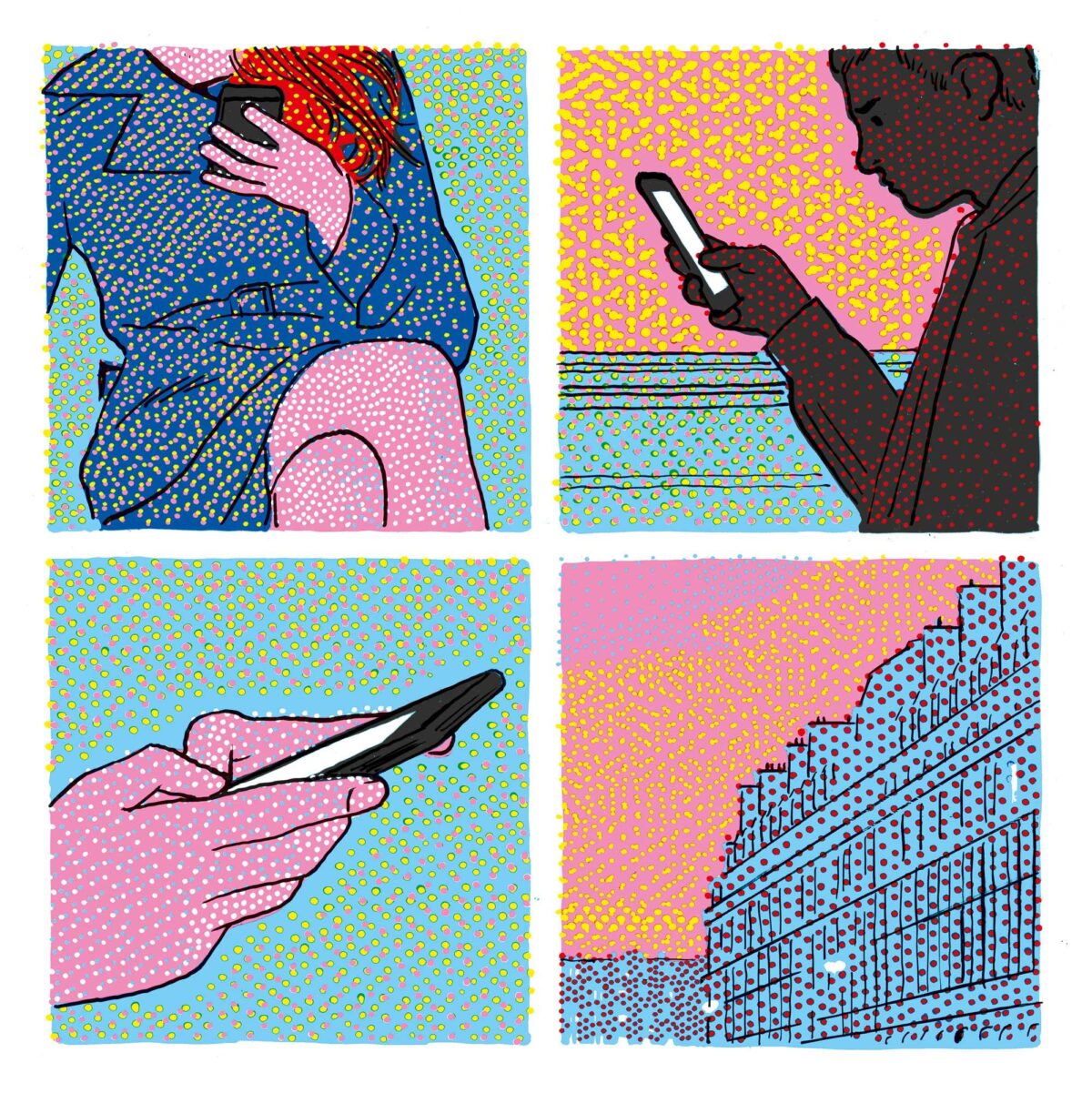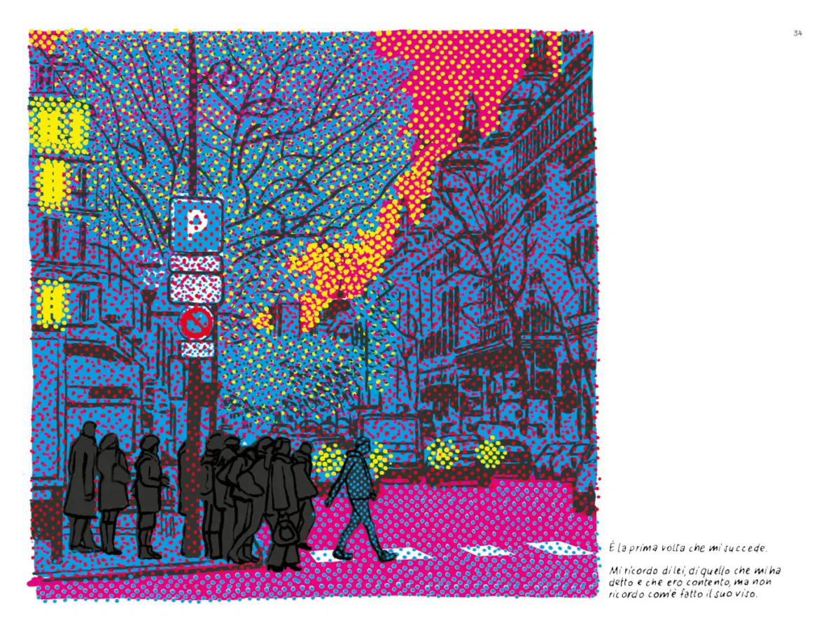 Vera protagonista di questo fumetto, allora, è la luce, oggetto di una decostruzione che passa anche dalla tecnica utilizzata: Giacomo Nanni si serve di un disegno puntinato che abbiamo trovato anche nei suoi lavori precedenti, ma lo fa in maniera apparentemente meno naturalistica, limitandosi quasi esclusivamente ai colori della stampa in quadricromia (CMYK) 1. Il colore, allora, viene letteralmente scomposto nei suoi elementi costitutivi e poi ri-composto in maniera artigianale sulla pagina: Nanni, infatti, disegna (realizzando i puntini uno ad uno, a mano) su fogli di acetato trasparente che vengono poi sovrapposti per creare il disegno completo, con una consapevolezza non comune dei nostri meccanismi percettivi e della tecnica in quadricromia.