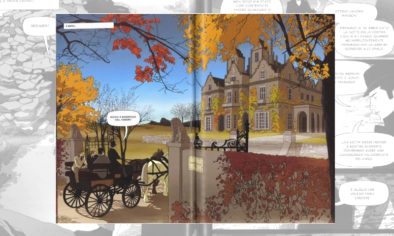 Contribuisce all’operazione anche la scansione dei layout delle tavole, piana e regolare, contraddistinta da una forte leggibilità, anche nelle gabbie più serrate. Solo di rado le sequenze di vignette planari lasciano spazio ad ariose splash page (l’entrata nel maniero dei Baskerville, la comparsa del Mastino, lo spuntare di Holmes nella brughiera, etc.) e sono momenti accuratamente calibrati, in rapporto ai climax del racconto.