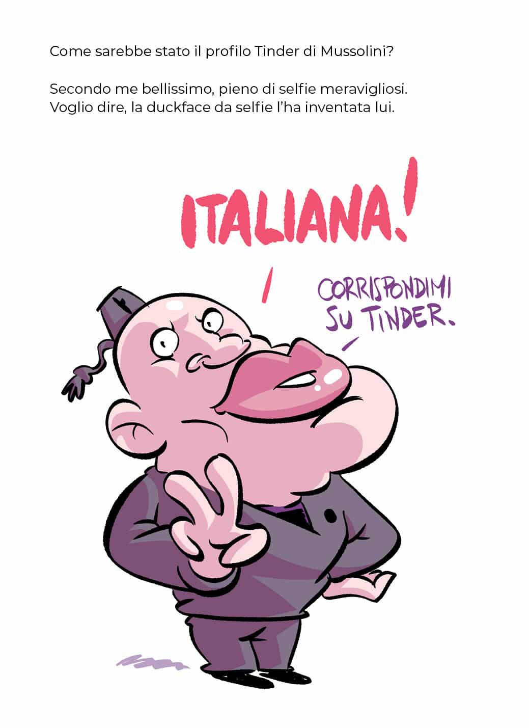 Gianluca Caputo, supervisore artistico della collana Fumetti Crudi, dichiara: “Ci sono molti modi di parlare del Fascismo, oggi, in Italia e forse proprio perché sono troppi, di solito si preferisce non cadere nell’angoscia dell’indecisione e desistiamo dal parlarne del tutto. Con Fabbri l’indecisione cade perché scegliamo di coglierlo nelle sue debolezze (dis)umane immaginandolo sul social network più in voga del momento. Il fascista è un rottweiler vestito da ape maia che se si libera ti sbrana, ma nel frattempo è divertente vederlo agitarsi.Questa è l’immagine del fascista che vale da solo anche tutto il libro ma questo volume non è solo questo. Ho sempre pensato che la satira è davvero feroce quando riesce a metterti davanti uno specchio e farti incazzare di quello che sei, non solo di quello che sono i cosiddetti “potenti”. Ti attacca per quello per cui ti sei identificato nella posizione dominante senza magari rendertene conto. Senza scomodare la Rivoluzione Sessuale di Reich (o se volete sì, a scelta vostra) è una analisi, dissacrante, quanto ci si aspetta, di alcuni aspetti sociali tanto semplici da capire quanto apparentemente impossibili da superare perché sovrastrutture morali (e non solo) che sembrano create, da noi stessi, ce lo impediscono: che fare sesso rende tutti più felici e contribuisce di conseguenza a creare anche una società migliore! Tinder potrebbe essere utile a questo? Forse, se non fossimo in Italia…