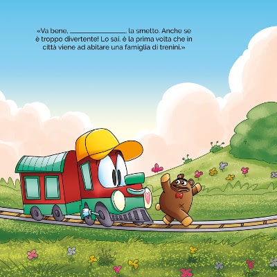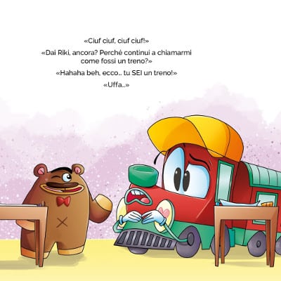 L’entusiasmo di Oriana per questo progetto mi ha subito trascinato in questa nuova avventura. Lavorare su questi personaggi non è stato affatto facile: è stata una bella sfida, creare immagini semplici ma accattivanti e nello stesso tempo relazionabili a momenti ben specifici della vita di un bambino. Ammetto che disegnare un trenino che si abbraccia o che si mette le mani sul cuore non mi era mai successo e Oriana è stata sempre ben attenta che tutto fosse fatto bene e senza lasciare nulla al caso. Ma alla fine ce l’abbiamo fatta! Ho anche cercato di dare un senso alle forme che descrivono i personaggi ad esempio il maestro Noah che ha delle forme rettangolari per dare l’idea di una persona molto sicura di quello che fa, molto ancorata a terra, un po’ come l’incredibile Hulk ma con la forza dell’esperienza. Ringrazio anche Tommaso (Valsecchi, ndr) per il prezioso supporto che mi ha dato con i colori.