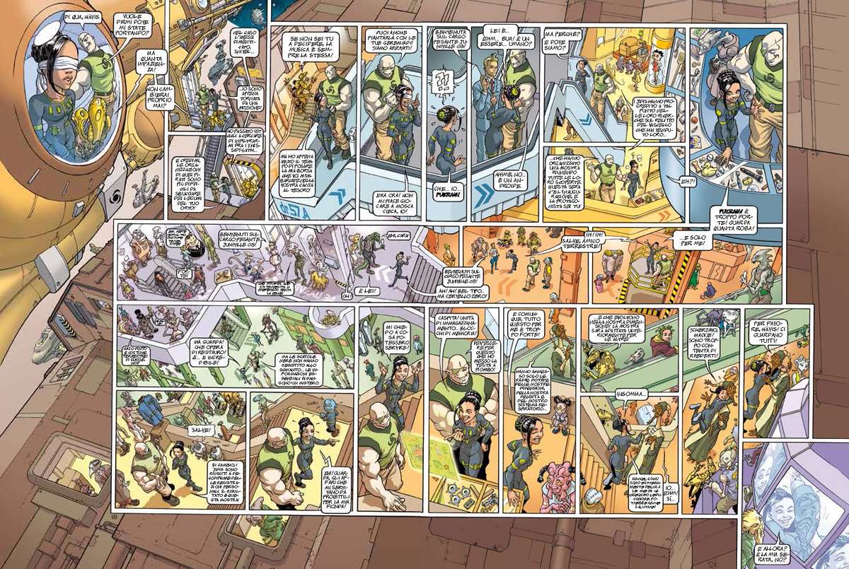 La gabbia strutturale pensata da Morvan e Buchet è un’altra costante della serie: concepita con una geometria regolare “a incastro” composta da vignette quadrate e rettangolari, trova nell’estro fantasioso e nelle capacità artistiche del disegnatore terreno fertile per svilupparsi con alcuni passaggi veramente eccellenti, come per esempio la doppia tavola (pagg. 4-5) presente nella quinta avventura, “J.VJ,..\ – La mia vita per i miei”, dove in un gioco di prospettive Philippe Buchet mostra contemporaneamente ciò che avviene all’esterno e all’interno di un’astronave.