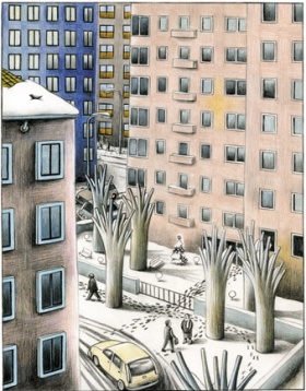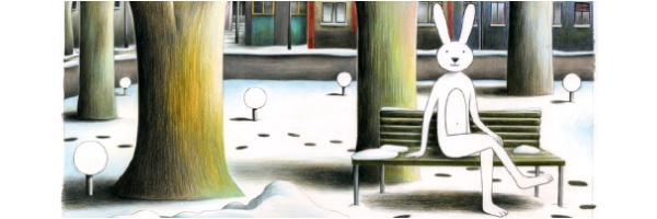 Le tavole sono sviluppate attraverso l’uso alternato di volumi di colore scuro e di colore chiaro: le facciate dei palazzi, certi sfondi ed il Grande Buio contrastano con la neve, le finestre illuminate ed il coniglio. Le due creature, per via del destino che le accomuna, sembrano farsi parodia.