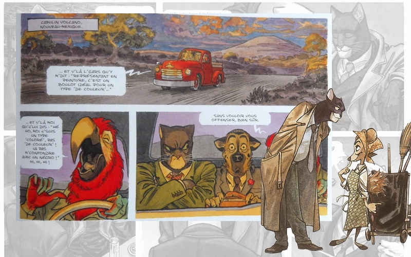 Un animale che parla e che si comporta come un umano determina una anomalia [narrativa]. Tuttavia la dimensione antropomorfica può, in una certa misura, farsi dimenticare e passare agli occhi del lettore per una semplice convenzione di racconto… In Blacksad l’anomalia crea nondimeno un sentimento di estraneità alla connivenza parodica, perché niente negli intrecci riporta a una intenzione comica o satirica… (Thierry Groensteen, Parodies: la bande dessinée au second degré, 2010 Flammarion).