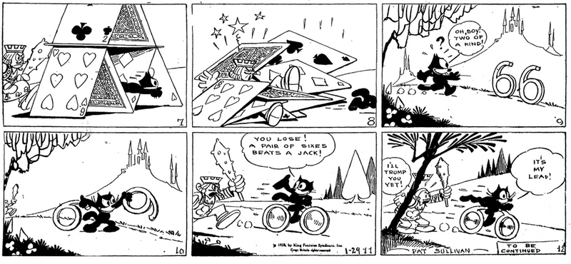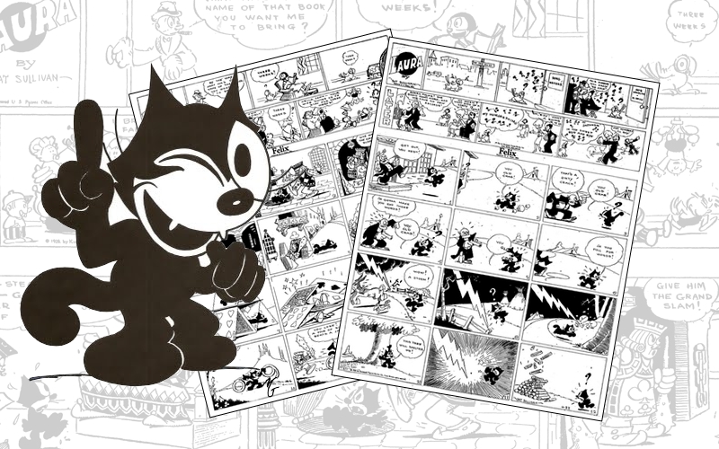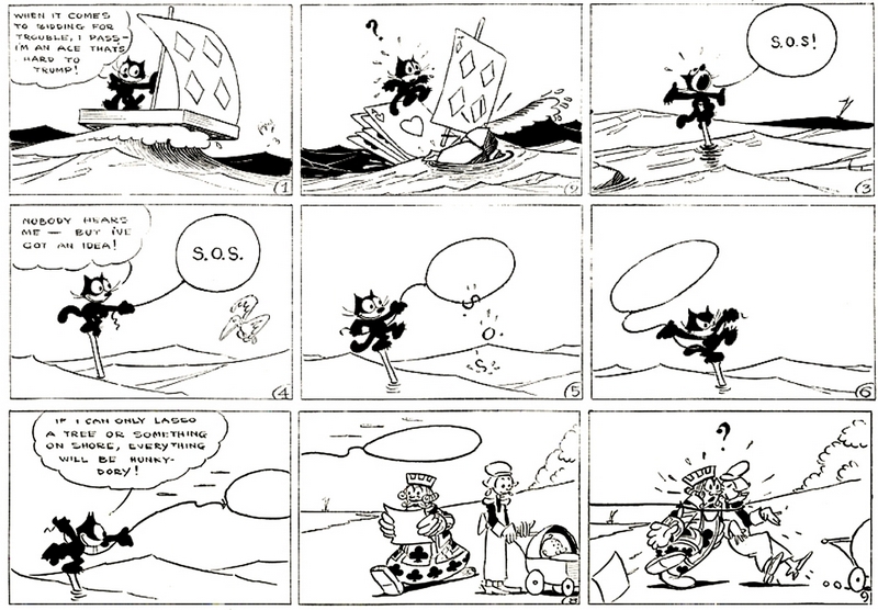 Felix, conosciuto dai più per via dei celeberrimi cartoni animati e per una lunga tradizione di merchandising, fu anche personaggio di una strip di successo a cavallo fra gli anni Venti e Trenta, grazie a una girandola di invenzioni grafiche e scoppiettanti trovate narrative come quella che trovate di seguito ad opera di Otto Messmer, che firmava la serie per conto dei Pat Sullivan studios.