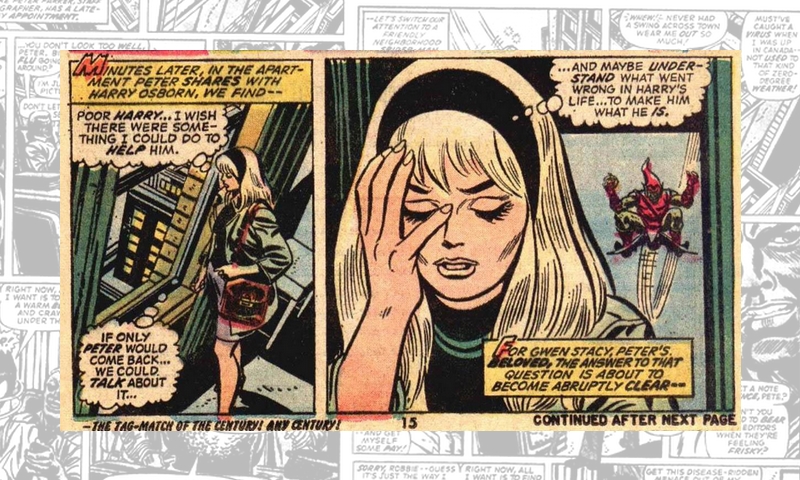 A cavallo tra i numeri 121 e 122 della serie, la storia d’amore tra l’adorabile figlia del capitano Stacy e il maldestro nipote della zia May subì una svolta inaspettata. La ragazza venne rapita dal perfido Goblin e l’eroe dovette gettarsi disperatamente al suo inseguimento, fin sulla sommità del ponte “George Washington” di Brooklin.