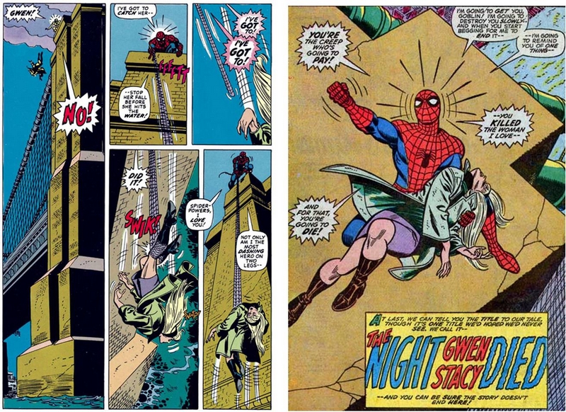Quando, al termine della caduta, la ragazza rimane appesa nel vuoto alla tela di Spiderman, una piccola ma significativa onomatopea (SNAP!) annunciò ai lettori che qualcosa si era spezzato per sempre nel corpo di Gwen e, di conseguenza, nella vita editoriale dell’Uomo Ragno.