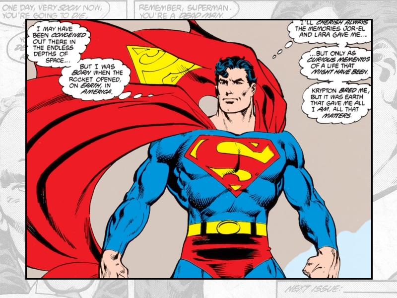 La più convincente riscrittura di Superman, nonostante abbia appena celebrato il trentennale, resta Man of steel (1986) di John Byrne. Al tema dell’identità aliena/americana, Byrne ha dedicato uno dei capitoli più belli e sentiti della miniserie. Quando, il ricchissimo Lex Luthor, dal fulvo e improbabile riporto di capelli (ehm…), manipola l’opinione pubblica mettendo in guardia sui pericoli che la natura aliena di Superman può provocare all’umanità, il primo a mettersi in discussione è lo stesso Clark. Solo nella conclusione dell’albo, l’Uomo d’acciaio trova piena consapevolezza in una dichiarazione  programmatica che, se vogliamo, è anche un’attestazione di poetica da parte di Byrne: