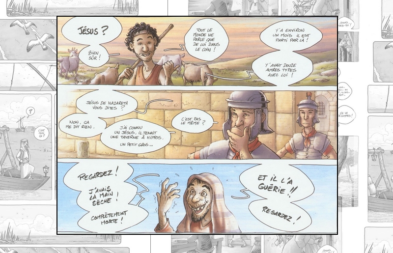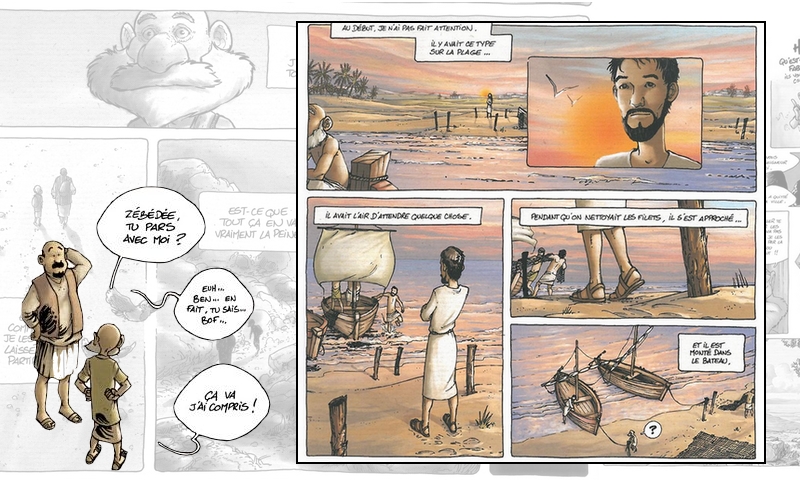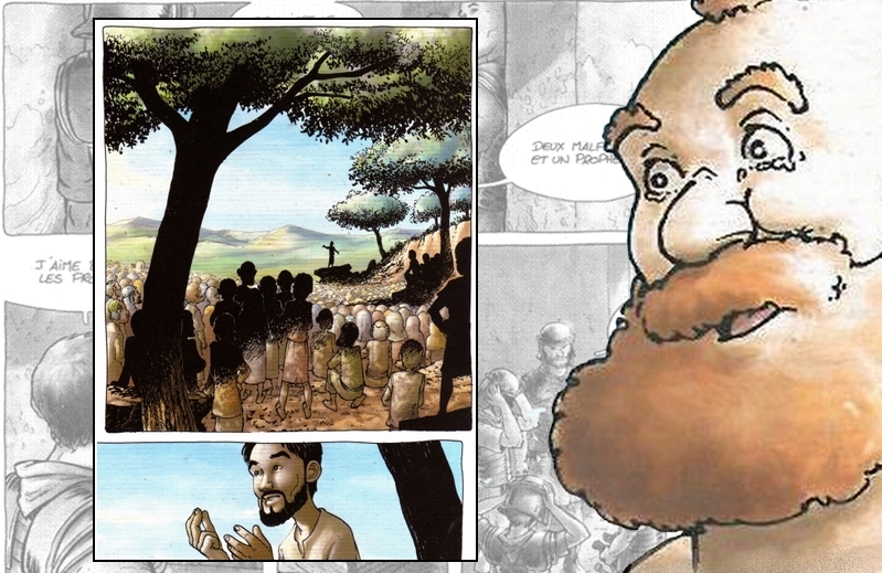 I tre padri (in)seguono i loro figli e il Nazareno in ogni tappa del viaggio verso Gerusalemme, ma ogni volta che sembrano sul punto di raggiungerli, per qualche accidente o incontro particolare, non riescono mai a farlo. Nella tradizione più tipica della narrativa picaresca, declinata in questo caso in balloon e vignette, il viaggio diventa un tempo narrativo continuamente dilatato. La sintassi fumettistica di Ratte trasforma ogni tappa del pellegrinaggio geografico e morale dei Padri in una “virgola” o una “parentesi” drammaturgica che approfondisce psicologie, rovescia stereotipi, ribalta certezze.