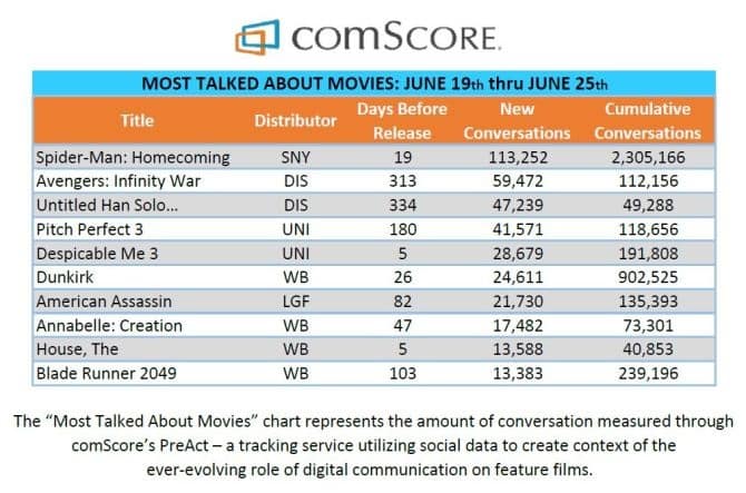 Discorso decisamente differente per Spider-Man: Homecoming, la cui campagna è rimasta saldamente ben ancorata al pubblico. Secondo la società di misurazione dei media, Comscore, tra il 19 e il 25 giugno la pellicola con protagonista Tom Holland ha continuato a dominare i social con 113.000 nuove conversazioni, un’attività che è stata ulteriormente spinta da una conferenza stampa con il cast a New York (tenutasi il 25 giugno) in cui sono stati annunciati anche i primi dettagli per il sequel, programmato per il 2019. In totale, secondo la società, il nuovo lungometraggio sull’arrampicamuri ha visto la creazione di 2,31 milioni di nuove conversazioni.